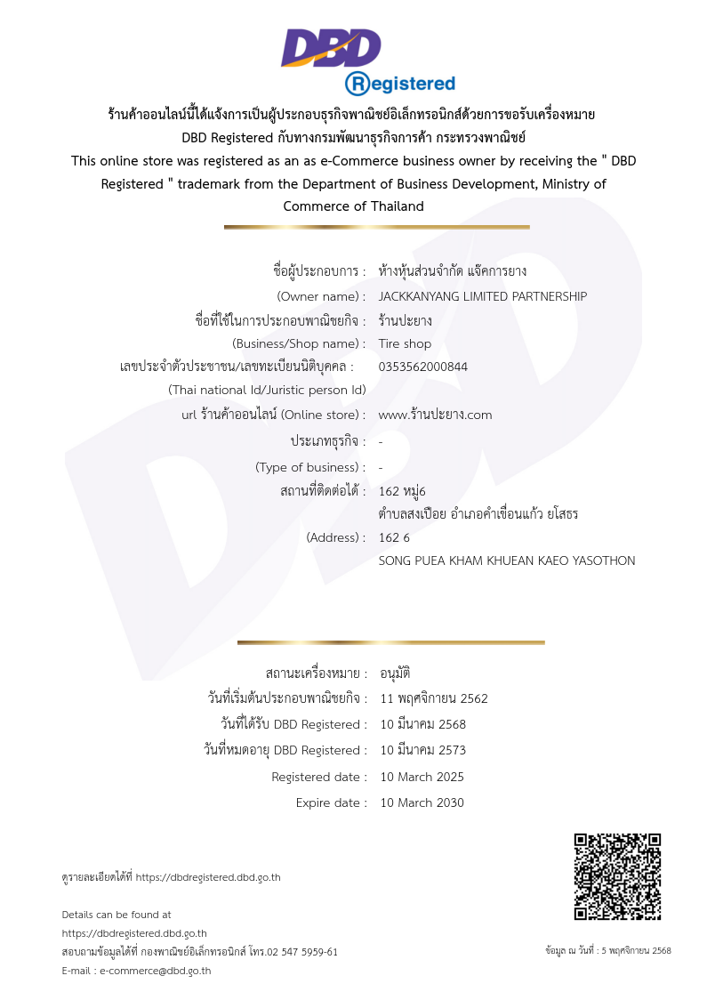 - ระยะเวลารับประกัน ขึ้นอยู่กับสภาพยาง อายุการให้งาน และ ลักษณะบาดแผลที่ทำการซ่อม ช่างจะเป็นผู้กำหนด และจะแจ้งระยะเวลารับประกันให้ทราบ.